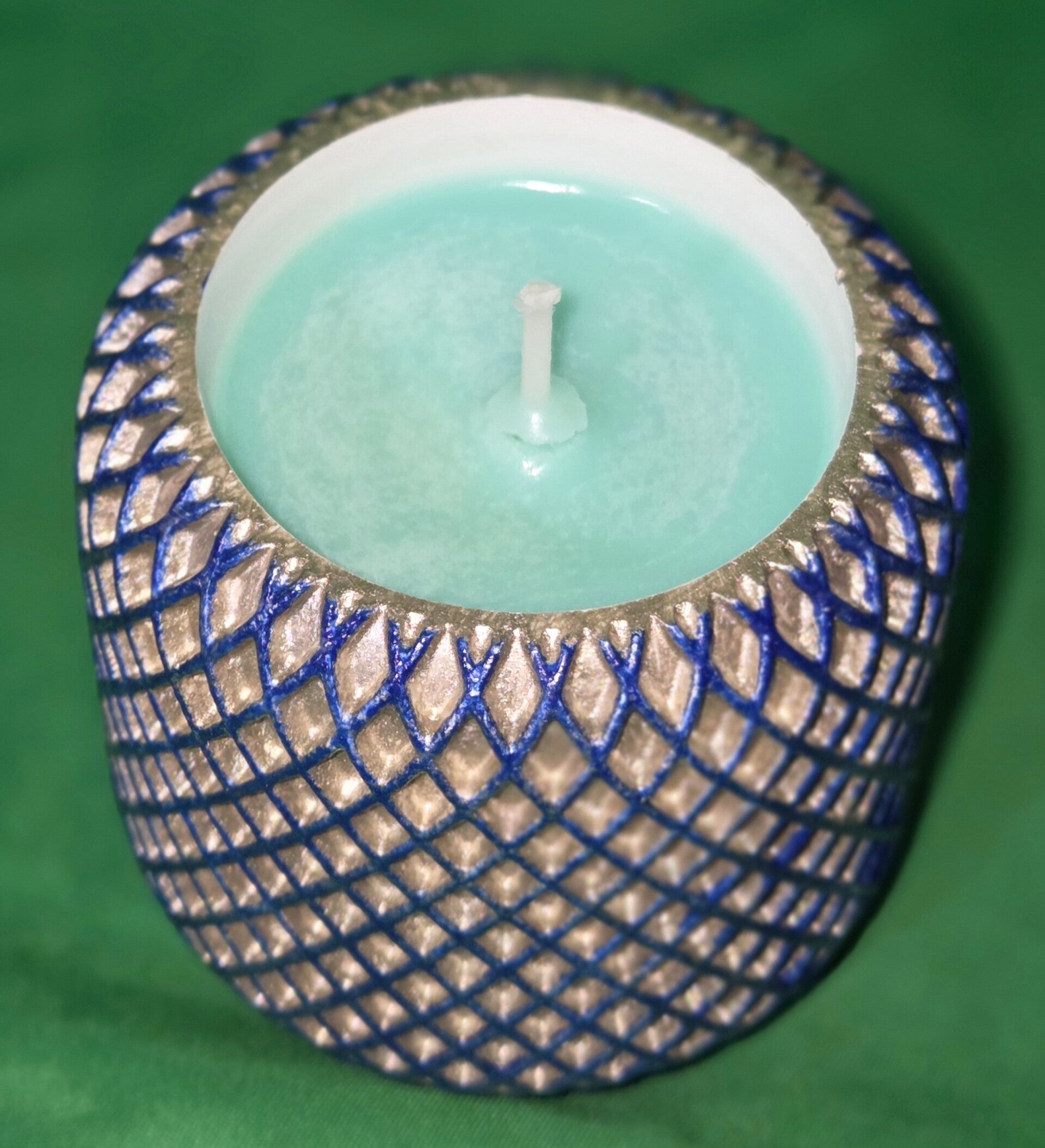 Ein schöner edeler Teelichthalter in gold/silber. Wir haben eine Kerze mit darein gegossen. Der Duft ist Matcha/Honig.