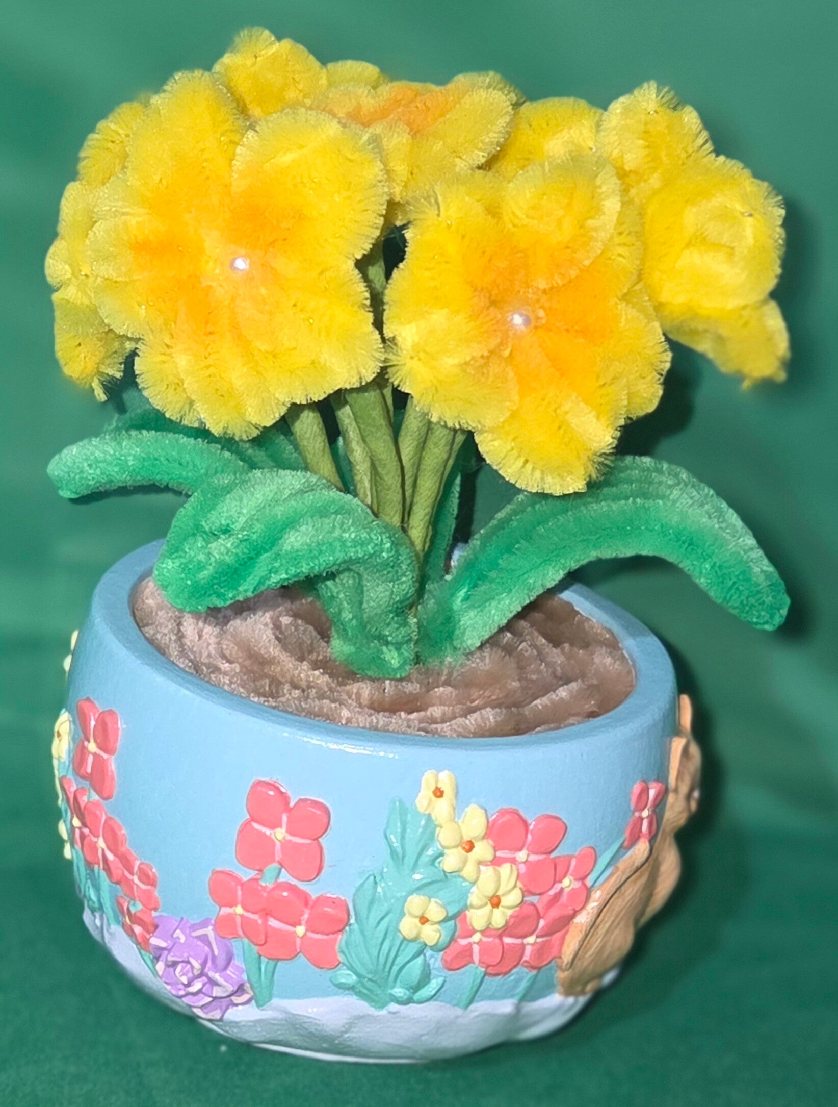 Ein sehr süßer Blumentopf was man unterschiedlich verwenden könnte. Man kann es als Blumentopf verwenden oder als Teelichthalter. So wie man es selbst für besser findet. Die Dekoration kann man jederzeit raus nehmen wenn man es so nicht behalten möchte. Die Blumen da drin sind komplett selbstgemacht.